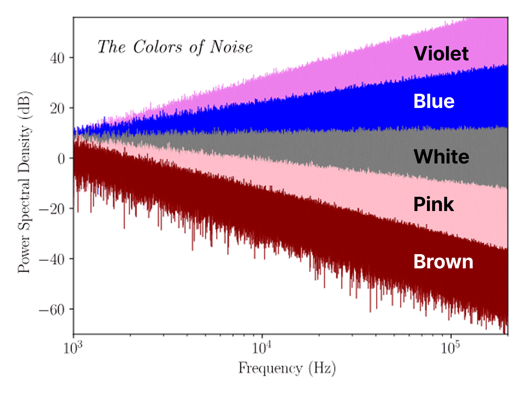 우리가 흔히 말하는 백색소음(White Noise)은 모든 주파수 대역의 에너지를 거의 동일하게 포함하는 신호이며, Pink와 Brown은 저주파가 강조되고, Blue와 Violet은 고주파가 강조되는 형태입니다.