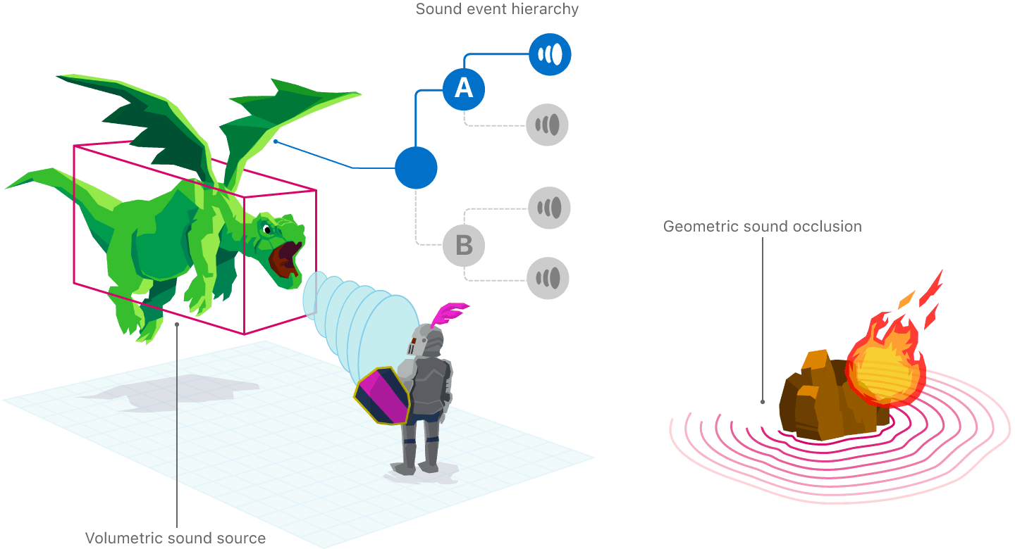공간 음향은 iOS의 PHASE (Physical Audio Spatialization Engine) 프레임워크로 구현했습니다. PHASE는 앱의 장면에 대한 기본적인 이해를 바탕으로 오디오가 장면의 특성에 따라 재생되므로 더욱 현실감 있는 공간 음향을 구현할 수 있습니다. 이를 이용하면 공간의 크기와 물체의 물리적 표면 특성에 따라 잔향 및 음향적 특성을 다르게 표현하는 것도 가능합니다.