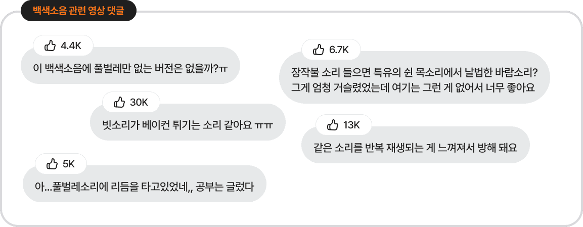 많은 사람들이 유튜브에서 백색소음 영상을 찾습니다. 타닥은 유튜브에서 인기 있는 백색소음 영상들의 댓글을 분석하여 백색소음을 듣는 사용자의 니즈를 파악하는 것으로 시작되었습니다.